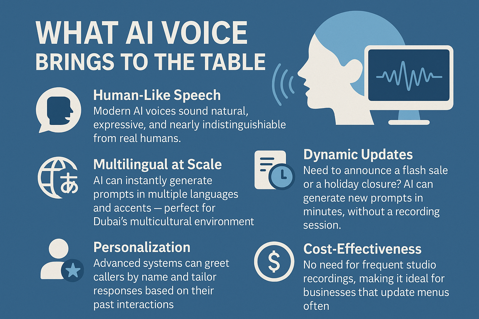 - Dynamic Updates: Need to announce a flash sale or a holiday closure? AI can generate new prompts in minutes, without a recording session.